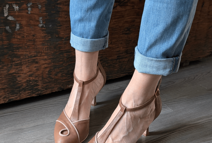 La silhouette gentilmente sfilata e dal gusto un po’ francese trova il giusto equilibrio nella mascherina chiusa con doppio cinturino sulla punta del piede che ne accorcia visivamente la lunghezza.